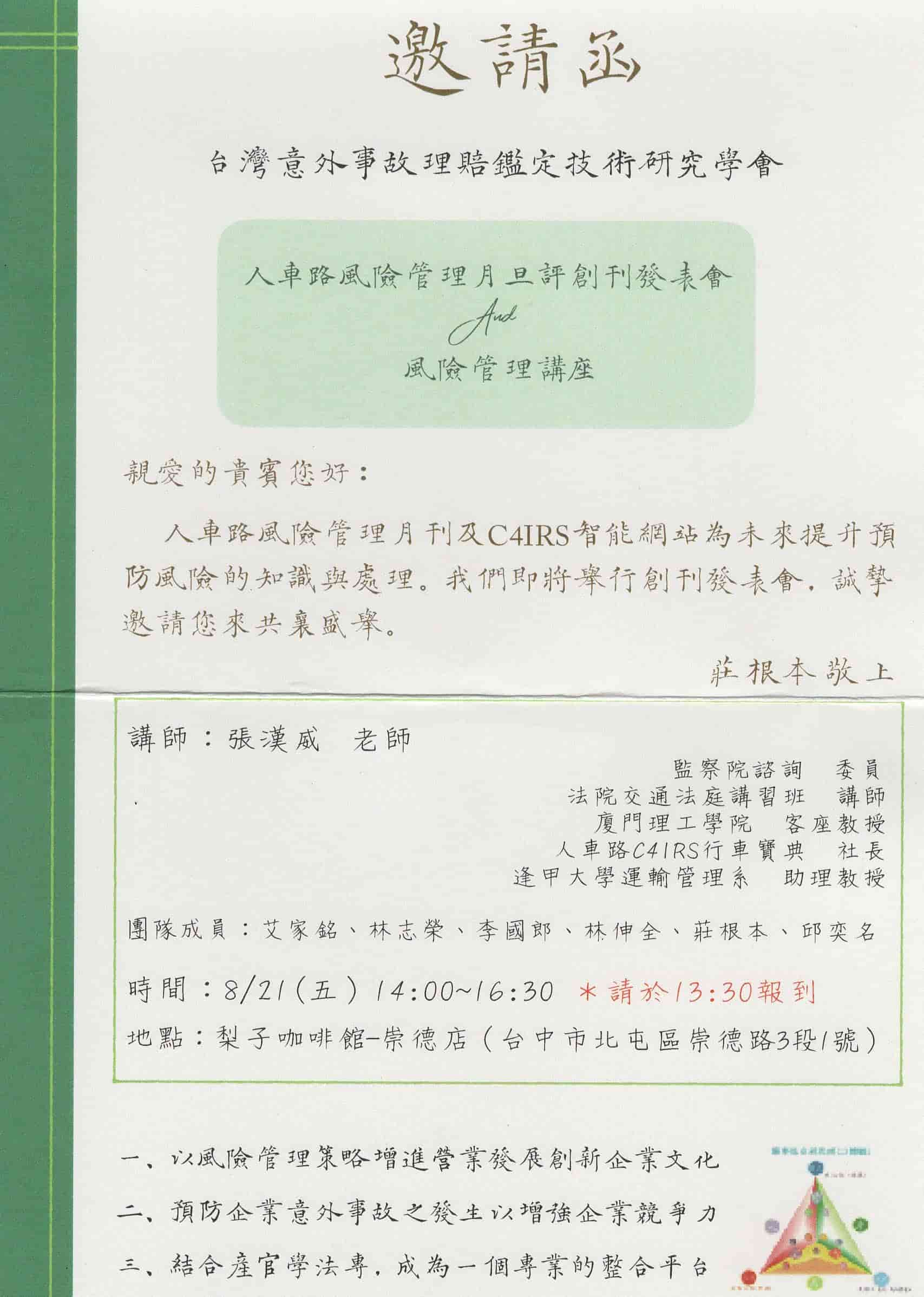 人車路風險管理月刊發表會及C4IRS智能網站專利發表會即將在這禮拜五8月21日下午13:30舉行!!